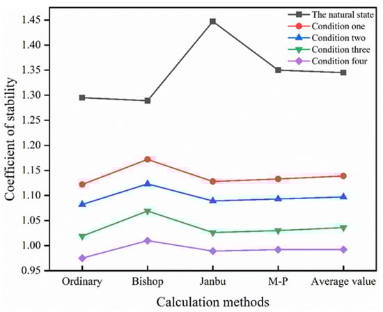 The stability coefficient of cutting slope under different working conditions is obtained by different calculation methods, and the average value of these slope stability coefficients is used as the final reference index. Figure 6 displays the statistics of the slope stability coefficients.