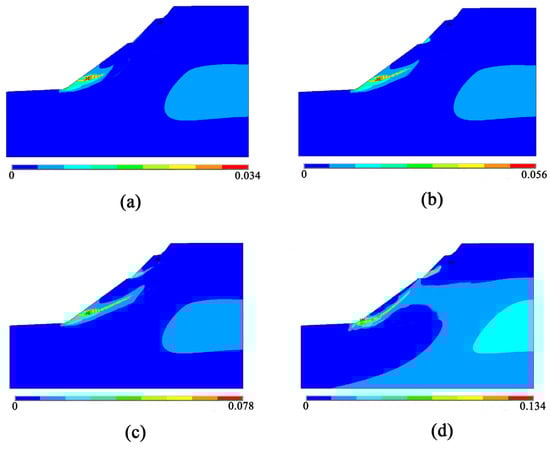 As indicated in Figure 7, the foot of the slope experiences the maximal strain, and the maximum strain at the critical state of slope instability is 0.078. The primary cause of the strain at the foot is that rainfall causes the mudstone to soften and the strength to deteriorate. So, the stresses accumulate here. Secondly, the location of the foot of the slope was influenced by the construction excavation, creating a local void at the foot and increasing the slope angle of the slide surface here. This increases the local sliding force and reduces the safety stability coefficient. Similarly, it can be seen from Figure 7 that the critical state of slope failure is that the rainfall intensity of 80 mm lasts for 1 day and stagnates for 5 h. At this time, the plastic strain runs through the entire landslide zone, causing the cutting slope to fail.