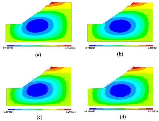 Figure 8 displays the maximum displacement of the X-axis of the slope top. Compared with the four plots, it can be seen that the maximum displacement decreases from 466.025 mm to 151.834 mm with the increase in rainfall, indicating that the slope is prone to local instability.