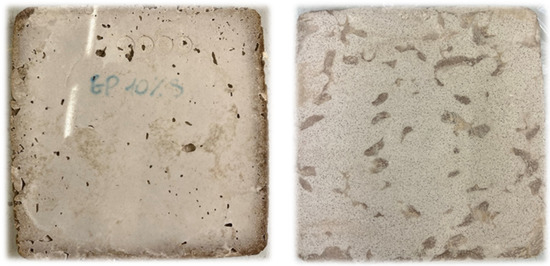 The areas covered by the dark cork particles (Figure 7) have been calculated via IMAGEJ software to be approximately equal to 5.85 ± 0.55%; 12.35 ± 2.65%; and 24 ± 1.49% for samples with 2.4, 4.8 and 9.1% cork waste. This value is the threshold limit of the amount of CW that we could insert in the geopolymeric paste without losing the degree of workability necessary to fill in the mold.
