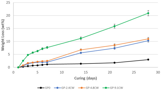 Figure 3 shows the weight loss of the geopolymeric samples during the first 28 days of ageing. It can be observed that the presence of cork waste greatly affects weight loss, namely, the value of weight loss recorded for the GP0 reference geopolymer is 3.016%, and it increases at around 10% for formulations GP-2.4CW (10.364%) and GP-4.8CW (10.941%). This behavior is related to the capacity of cork to absorb water and then slowly release it. The high weight loss observed for the GP-9.1CW sample (20.872%) was probably due to the excessive use of water to work the sample, as already mentioned in Section 2.2.