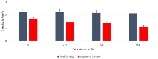In Figure 4, it can be observed how the apparent density decreases as the percentage of cork increases after 28 days, as a light and porous material is inserted into the geopolymer matrix that lightens the compound. Regarding the real density, it remains almost constant with a slight decrease for the 9.1 sample.