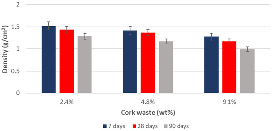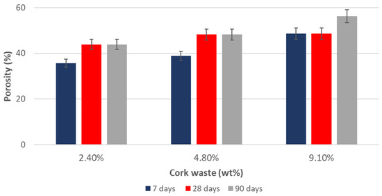 Within the same formulation, the apparent density decreases with curing time (Figure 5). This is probably due to the fact that cork retains water, which, over time, manages to evaporate, making the material lighter, and therefore less dense and also more porous, as shown by the porosity trend of Figure 6.
