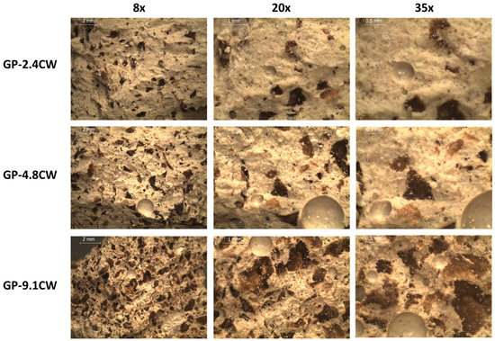 From the optical micrographs (Figure 7), it is possible to observe the presence of pores with variable diameters, from 0.5 to 1.7 mm, which are clearly identified as air bubbles trapped in the geopolymeric paste. The presence of pores in GP-2.4CW and GP-4.8CW is quite similar, although we can note the presence of some larger pores in the geopolymer with 4.8% cork. In GP-9.1CW, on the other hand, there is a greater quantity of pores, reflecting the data obtained with the real and apparent densities. Therefore, the presence of cork leads to a higher porosity in the geopolymers, not only due to the presence of cork itself, but because this material makes the geopolymer in the fresh state much less workable and pastier, a feature that makes correct vibration, and therefore the correct elimination of the air inside the paste, more difficult (see image of GP-9.1CW sample at 35× magnification).
