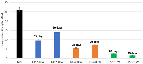 In the present investigation, the compressive strength tests were carried out after 28 and 90 days of curing on all the geopolymer samples. From Figure 8, it is possible to notice that after an addition of 2.4, 4.8 and 9.1% of cork waste, the values change. In geopolymers with 2.4% and 4.8% of waste cork, an increase in the value of the mechanical compressive strength can be observed, with the time duration confirming that geopolymerization occurs and it is not hindered by cork powder. In the case of GP-9.1CW specimens, the compressive strength values are so low that it is difficult to assess a trend.