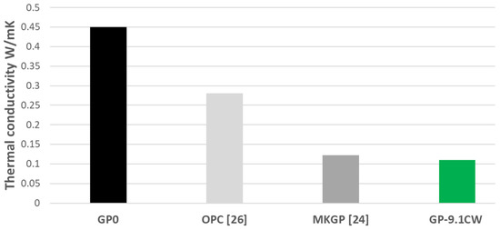 In Figure 9, GP-9.1CW has been compared with other geopolymers from the literature [29,30,31]. It can be noted that compared to different formulations of geopolymers with only metakaolin, the value is much lower. In addition, if compared with classic building materials such as concrete (K ≈ 0.28 W/mK for insulating mortars; K ≈ 1.6 W / mK for base mortars [29]), this value is much lower and is almost 1/3 lower for insulating mortars and even almost 15-times lower than the thermal conductivity of base mortars. Despite this, it is not possible to define the resulting geopolymer as a proper thermal insulator, since it would be necessary to reach K values of at least 0.06–0.09 W/mK according to UNI EN 998-1 [16,32]. However, the K value obtained for the GP-9.1CW composite is a good result in view of considering the geopolymer as a surface that is not very sensitive to heat, not perfectly insulating, but demonstrates better performance when compared to classic building materials.