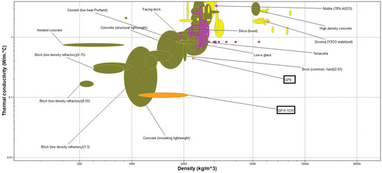 - ▪ Thermal insulation materials play an important role in construction. The production of new insulating materials makes it possible to reduce the energy consumption of buildings. External walls are one of the most important structural elements of buildings. In Ashby’s chart (Figure 10), which demonstrates common applications of lightweight building materials/ceramics provided in the ANSYS GRANTA EduPack R2021, it can be observed that our geopolymer lightweight composites are within the range of insulating and building materials commonly used [33]. Concerning the values of thermal conductivity reported in the literature in the study [14], we can confirm that our value of about 0.11 W/mK is lower than those recorded for 18 vol% pyrolyzed cork, i.e., 0.56 W/mK.