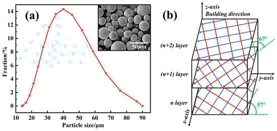 The parts were all produced by NCL-M150 additive manufacturing equipment (Nanjing Chamlion Laser Technology Co., Ltd., Nanjing, China). The gas atomization method was used to produce Ti-6Al-4V powder. Table 1 shows the powder’s main chemical composition. Figure 1a displays the morphology and particle size distribution of the powder, which is between 10 μm and 90 μm, with an average of 42 μm. The parts were manufactured by remelting with the laser scanning speed and power tuned to 1800 mm/s and 160 W, respectively. The scanning strategy selected the serpentine path and 57°/67° rotation scanning. The remelted layer’s scan path was perpendicular to the initial, and the laser scanning speed and power were adjusted to 1600mm/s and 180W, respectively. The diagram of the remelting operation is shown in Figure 1b, where the blue line was the initial scanning path and the red line was the remelting scanning path.