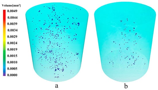Three-dimensional pore diagram of the fabricated specimens before (a) and after (b) the remelting process.
