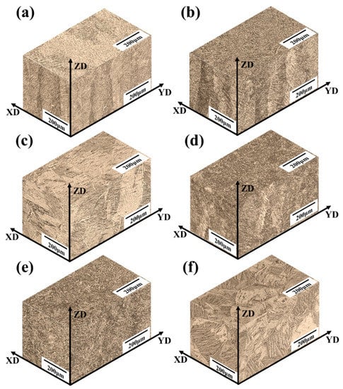 Ti-6Al-4V is commonly employed in the aerospace industry for its excellent specific strength and corrosion resistance [1,2,3]. It has become an indispensable structural material in aero engines, primarily used as compressor discs and blade casings to reduce engine mass and improve thrust ratio. In the processing of complex titanium alloy aerospace structural parts, traditional methods suffer from poor machinability, complicated processes, and expensive costs. However, LPBF has advantages in these aspects and has been widely used [4,5]. Reliability studies have become the focus of studies on the LPBF method.