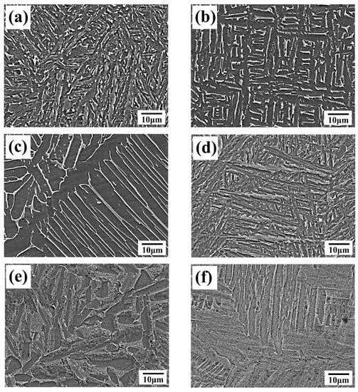 The width of the slatted α phase was measured by “ImageJ” software. The acicular martensite α’ in the microstructure of the as-built specimens is only 0.87 ± 0.24 μm. For Ta < Tβ, the lath thickness distribution is between 1.8 ± 0.24 μm for the 850FC specimen, between 2.3 ± 0.24 μm for the 950FC specimen, between 1.9 ± 0.18 μm for the 850WAC specimen, and between 3.5 ± 0.21 μm for the 950WAC specimen. This indicates that the lath thickens with increasing Ta. For Ta > Tβ, the mechanical performance of the specimens is determined by α colonies. The α colony size of the 1050FC specimen is 328 μm ± 10 μm, while that of the 1050WAC specimen is 198 ± 8 μm. This indicates that the colony size depends on the cooling rate and is negatively correlated.