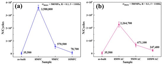 Figure 6 shows the change in the average fatigue life (N) of different heat-treated specimens relative to the as-built specimens. All heat-treated specimens improve their fatigue performance at 500 MPa compared with as-built specimens. In Figure 6a, 850FC exhibits better fatigue life, which increased by 101 times compared with the finished specimens. In Figure 6b, the fatigue life change shows the same trend. 850WAC showed better fatigue life, which increased by 63.7 times. Other heat treatments also improved the fatigue life, but not significantly. As a result, the fatigue life of the specimens is improved because of microstructural changes, and the 850 °C specimens exhibit significantly better fatigue performance, which is something we need to focus on.