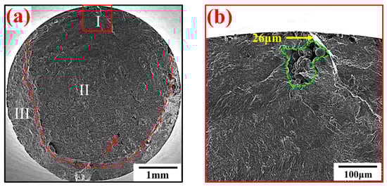Figure 7 shows the representative fracture surface and crack initiation zone of the as-built specimen. The entire fracture surface is divided into three zones, as shown in Figure 7a. Among them, Zone I (the zone included in the red box) is the crack initiation zone. Figure 7b is an enlarged view of the crack initiation zone. Zone II is the crack propagation zone, which occupies most of the fracture surface area. Zone III is the transient interruption zone, which occurs when the load-bearing area is insufficient. Cracks occur in the polished as-built specimen at minor near-surface defects, which are LOF. The defect is located about 26 μm from the specimen’s surface, and its fatigue life is 38,600 cycles. During fatigue propagation, the dominance of the multi-faceted fracture morphology can be seen, indicating the lower toughness of the as-built specimen. There are also many holes in the crack propagation surface near the transient fracture zone, indicating that the fatigue fracture is brittle and associated with the “brittleness” of the acicular martensite of the as-built specimen. The lower fatigue life also indicates that the acicular martensite structure has a low resistance to crack initiation—that is, the acicular martensite is more sensitive to porosity.