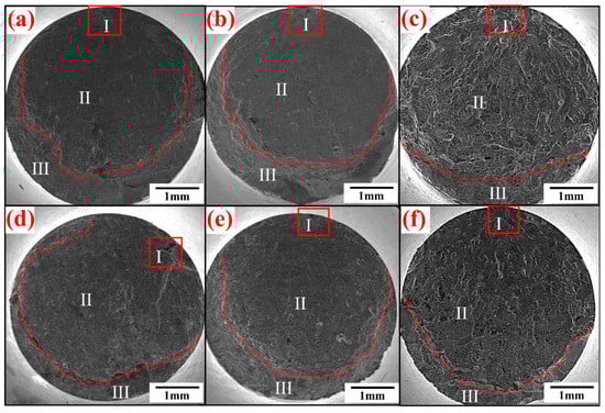 Figure 8 shows representative fracture surfaces of different heat-treated specimens. The figure indicates that each heat treatment fatigue specimen initiates cracks from the defects on or near the surface, and all propagate from a single source. The fracture surfaces are clearly divided into three zones. By comparison, it is found that the fatigue propagation surface (zone II) of 850FC and 950FC is relatively smooth (Figure 8a,b), 850WAC and 950WAC followed (Figure 8d,e), and 1050FC and 1050WAC (Figure 8c,f) exhibited a rougher surface. No obvious river lines can be seen on the smooth surface, meaning that it has good plasticity. On the contrary, the river pattern is obvious on the rough surface, which means brittleness, which is also consistent with the performance of the microstructure. The β phase in the two-phase zone improves the plasticity of the material, while with the coarsening of the α phase, the dislocation stress increases and the plasticity decreases, so 850FC shows a smoother surface. Comparing zone III, it is found that 1050FC and 1050WAC show a smaller area of the transient fracture area, indicating that the α colony exhibits better resistance to fatigue fracture.