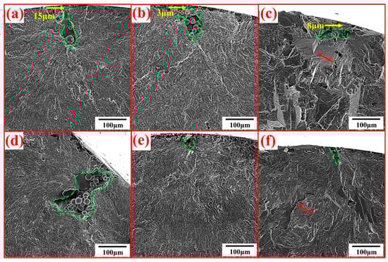 Figure 9 shows the crack initiation zone of the heat-treated specimens corresponding to Figure 8. The figure indicates that all of the heat-treated specimens were fatigue fractured due to LOF defects near the surface, and the fatigue cracks propagated in a fan shape. The crack initiation of 850FC (Figure 9a) is about 15 μm from the specimen’s surface, with a fatigue life of 2,733,000 cycles, showing a high fatigue life. The crack initiation of 950FC (Figure 9b) is about 3 μm from the specimen’s surface, with a fatigue life of 575,400 cycles. The crack origin of 1050FC (Figure 9c) is about 8 μm away from the specimen’s surface, with a fatigue life of 78,700 cycles. The surface of the source zone shows obvious cleavage morphology, and a large red arrow can be observed. The larger the grain size, the larger the cleavage plane, which also verifies that the macroscopic mechanical properties are determined by the size of α colony. 850WAC (Figure 9d) nucleated from relatively large surface defects, with a fatigue life of 1,521,300 cycles. Both 950WAC (Figure 9e) and 1050WAC (Figure 9f) nucleated from tiny pores on the surface, with a fatigue life of 671,100 and 141,700 cycles, respectively. The cleavage characteristics of the 1050WAC source zone are not obvious, and secondary cracks appear in the propagation zone (red arrow).