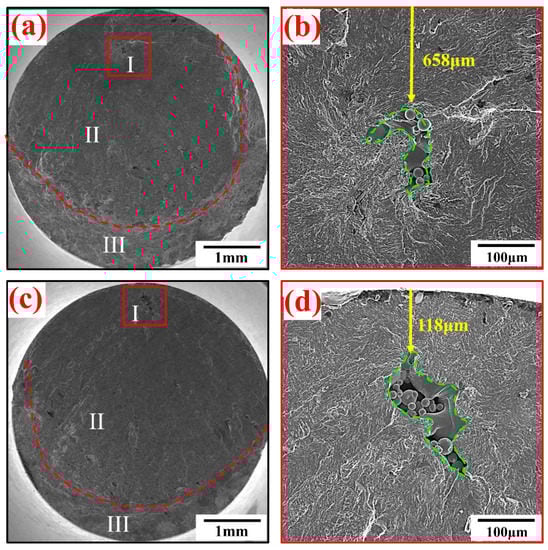 Figure 10 shows another representative fracture surface and crack initiation zone of 850FC and 850WAC, respectively. The crack initiation zone I moves inward, and the fatigue fracture nucleates from the internal defects that are far from the surface, as displayed in Figure 10a,c. The enlarged view of the crack initiation zone of 850FC is displayed in Figure 10b. The defect is located about 658 μm from the surface, and its fatigue life is 3,961,000 cycles. Compared with 850FC in Figure 9a, the site of crack initiation also caused a further improvement in fatigue life, indicating that the location of crack initiation and the microstructure jointly caused the improvement in fatigue life. Figure 10d shows an enlarged diagram of the crack initiation of 850WAC, the depth of the defect from the surface is about 118 μm, and the fatigue life is 2,175,400 cycles. The fatigue life is significantly improved compared to 850WAC in Figure 9d. The experimental results indicate that the deeper the crack initiation location, the longer the fatigue life. The microstructure and initiation location jointly determine the fatigue life.