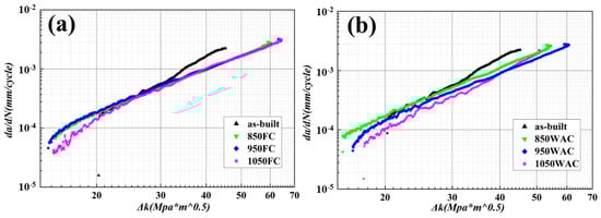 Figure 11a shows the CGR curves of the AT specimens obtained by the incremental polynomial method. In the AT specimens, different heat treatment temperatures show the same trend. When the stress intensity factor Δk < 20 MPa m0.5, the CGR curve of 1050FC is the lowest while 950FC is the highest, but it is not much different from that of 850FC. When 20 MPa m0.5 < Δk < 30 MPa m0.5, the difference between the CGR curves of all heat-treated specimens gradually becomes smaller, and the CGR of the as-built specimen remains similar to those of the heat-treated specimens. When Δk continues to increase, the CGR of the as-built specimens is higher than that of the heat-treated specimens. In the low Δk area, there is a certain fluctuation in the CGR. Overall, 1050FC has higher crack growth resistance, and the as-built specimen has the lowest.