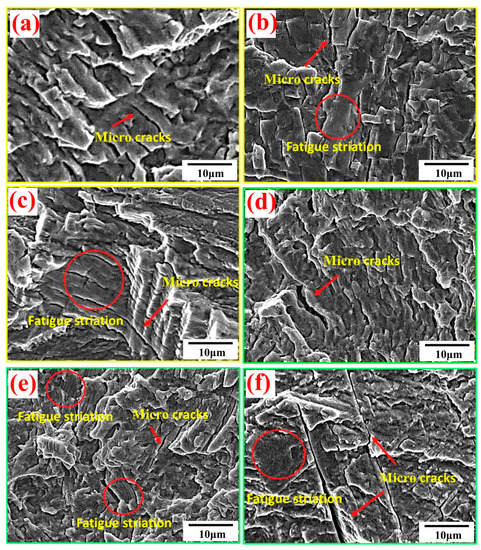 Figure 12 shows the fracture morphologies of the Paris zone of the fatigue crack growth specimens with different heat treatments. Fatigue cracks propagate from left to right, and it can be found that secondary cracks or micro-cracks appear on the fracture surfaces of all specimens. The fracture is dominated by cleavage fracture, and the width of the cleavage step gradually widens with the growth of α grains. On the plane of the partially cleaved steps, there are mutually parallel fatigue striations perpendicular to the nominal crack propagation plane, but not all steps. Fine fatigue striations appear on the cleavage facets of 850FC (Figure 12a) and 850WAC (Figure 12d), which are difficult to observe, and related to the fineness of α grains. The cleavage planes of 950FC (Figure 12b) and 950WAC (Figure 12e) are widened, and fatigue striations are also more obvious. The cleavage steps of 1050FC (Figure 12c) and 105WAC (Figure 12f) were further enlarged, and the secondary crack between the planes grows deeper into the material.