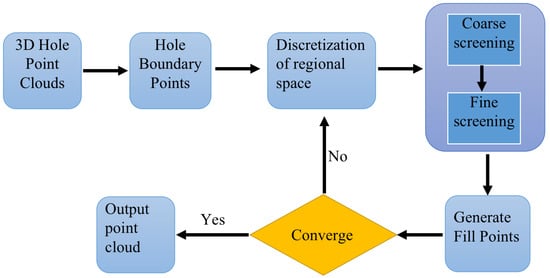The input of our method is a 3D point cloud with holes, and the output is a fully repaired point cloud. The main flow of our algorithm is shown in Figure 2. The extraction of boundary points is the reference centroid method [26,27].