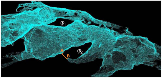 Let be the missing area inside the 3D point cloud, and be an unclosed missing area at the outer boundary. As illustrated in Figure 3, the line segment connecting A and B is marked by , where A and B are points on the boundary. Any boundary point in is in the closed area defined by line segments and . Assuming that (in this paper, ), the boundary arc length of is . If , is considered a boundary hole. Inner hole and boundary hole are collectively referred to as hole.