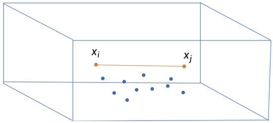 In the repair of a 3D point cloud, let S be a 3D vector space containing and . For the segment formed by the connection of and in subset s of S, when all new filling points contained in s are in the direction domain of the line segment, s is a convex set. As shown in Figure 4, the new fill (blue) points were located in a direction of the line segment connected by and . In the repair of 3D point clouds, the properties of convex sets are as follows: (1) The intersection of any convex set is also a convex set.