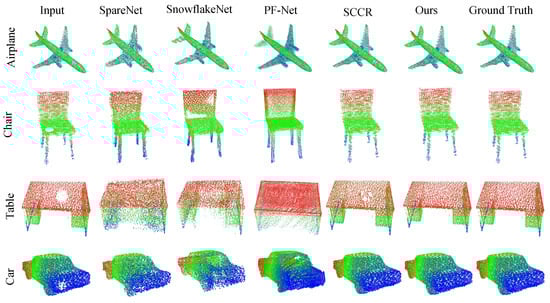 In this section, we experimentally analyze the method proposed in this paper. We conducted the experiments on an Intel Xeon (R) 2.50GHz vCPU computer with 8.00 GB memory. To verify the performance of this method, we conducted quantitative and qualitative comparisons with the latest technologies of SnowflakeNet [30], SpareNet [31], PF-Net [11] and SCCR [32]. We evaluated our method on widely used public datasets PCN [33] and Stanford. The PCN and Stanford datasets are public point-cloud datasets that have greatly contributed to the research of 3D vision. In addition, we experimentally analyzed the point-cloud data that we had collected to fully prove the effectiveness of our method. Similar to [34], we used GPSNR and NSHD as quantitative evaluation indicators of the experiment. GPSNR [35] measures the error between Point Clouds A and B on the basis of the optimized peak signal-to-noise ratio (PSNR). The higher the GPSNR is, the smaller the difference between A and B. Normalized symmetric Hausdorff distance (NSHD) [36] is a normalized metric based on the unilateral Hausdorff distance. The lower the NHSD is, the smaller the difference between A and B.