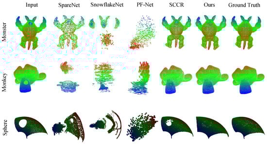 Figure 6 shows the visualization effect on the point cloud collected by Stanford and our method. We selected monsters, monkeys, and a sphere as experimental point clouds, and none of these three categories of point clouds was used as training data for SpareNet, PF-Net, and SnowflakeNet. The monster point-cloud model was from the Stanford dataset, and we collected the monkey [37] and sphere point-cloud models. The experimental results show that SpareNet, PF-Net, and SnowflakeNet repaired the results, severely distorting the original shape of the point cloud and causing the repaired point cloud to be far from the true shape. SpareNet, PF-Net, and SnowflakeNet produced bad results because they were constrained by the training data and could not complete the untrained point cloud. However, training a large amount of data consumes huge amounts of time, so their methods cannot be widely used. Compared with the SpareNet, PF-Net, and SnowflakeNet methods, our method only focused on the missing areas and was not limited by the object category. At the same time, our method could effectively repair various point clouds regardless of target category. This shows that our method has wider applicability. On the pipe surface model, due to the large hole area and the scattered point distribution, the SCCR method could not completely repair the hole. Compared with the SCCR method, our method could not only completely repair the holes in the point cloud, but also ensure that the repaired surface was consistent with the surrounding neighborhood.