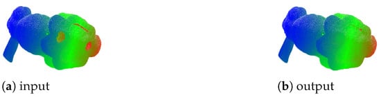 Table 2 shows the GPSNR performance comparison values of our and other methods. GPSNR is based on the optimized peak signal-to-noise ratio (PSNR) to measure the error between Point Clouds A and B. The higher the GPSNR is, the smaller the difference between A and B. The experimental data show that our method achieved the highest GPSNR on each point-cloud model with an average of 48.47 DB, which was 44.9% higher than that of a suboptimal method. The experimental results show that the point cloud repaired by our method had high fidelity.