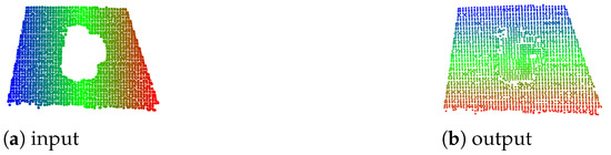 With the successful application of PointNet [8] and PointNet++ [9] on point clouds, the method based on depth learning [10,11,12,13,14,15,16,17] was applied to point-cloud completion. Point-cloud completion methods implemented with an encoder–decoder framework mainly follow the coarse-to-fine principle to achieve point-cloud completion [18,19]. However, such methods often add new points in the nonhole area, changing the inherent structure information of the point cloud [20,21,22,23]. At the same time, the effectiveness of these methods is usually limited by the size of the training data [24,25].
