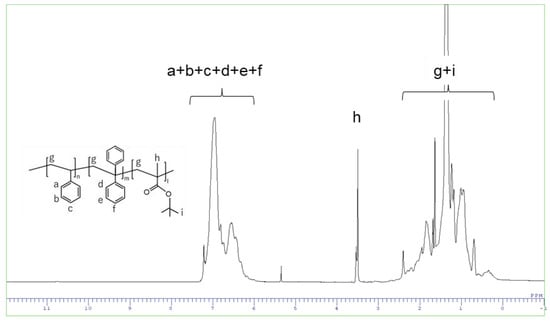 Reactions using microreactors are attracting attention as highly efficient production methods because they can regulate reactant supplies, mix the solution rapidly, and control the reaction temperature precisely. Thus, microreactor systems are expected to improve the reaction rate and selectivity compared to conventional batch reactions [14,15,16,17,18]. In the case of synthesizing polymers, they will be beneficial for obtaining narrow molecular-weight distributions, achieving high monomer-conversion rates, and producing block copolymers by a continuous process without using a special cooling device [19,20]. Thus, the block co-polymers were prepared using the microreactor system (Sanko Seiki Kogyo Co., Tokyo, Japan), where the optimized protocols were developed for synthesizing the block copolymer. The 1H NMR spectrum of the products after the polymerization reaction showed the signal derived from monomers containing the reactant, suggesting the polymerization had successfully proceeded. The 1H NMR spectrum of the representative spectra BL-01 before deprotection is shown in Figure 2, which is consistent with results from a previous paper [21]. The GPC measurements of the products showed a unimodal peak with narrow distributions, further supporting the successful preparation of the block copolymers in the controlled manner. Note that the acid values, which indicate the number of carboxyl groups and hydrophilicity of the polymers, well reflected well the monomer feed ratios of the t-BMA, thus suggesting that the deprotection of the tertial-butoxy groups had successfully proceeded. The molecular weights, dispersity (Đ) and acid values are shown in Table 1, where block copolymers with sharp molecular-weight distributions were obtained from synthesis by microreactors.
