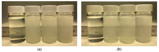 Subsequently, the small amounts of 28 wt% polymer solutions (BL-01, BL-02, BL-03, BL-05) in MEK and DEG were mixed with large amount of KOH aqueous solutions, where KOH molars were adjusted to be 1.2 times that of the carboxyl group in the polymers, and the final polymer concentrations were adjusted to be 0.1 wt%. As summarized in Table 4, in the case of the MEK solution, the alkaline aqueous solution became cloudy instantly, after mixing with the polymer solution; the polymers were not dissolved at all, even after treatment with ultrasonic waves for more than 1 h thereafter. In contrast, aqueous polymer solutions with transparency can be obtained from the polymer solutions in DEG. It should be noted that the polymers cannot be directly dissolved in the KOH solution containing 0.3 wt% DEG (Figure 3), which is the same solvent composition finally obtained when preparing 0.1 wt% polymer aqueous solution from the 28 wt% polymer solutions in DEG. Solubilities of BL-03 and BL-05 in alkaline aqueous solution were still poor, despite increasing the DEG compositions to 0.5 and 0.9 wt%, respectively, with the addition of ultrasonic wave for 1 h (Figure 3). From these results, DEG did not necessarily work, as changing the aqueous-solution nature, including the polarity, to dissolve polymers containing DEG in the aqueous solution is not important, but the process of dissolving polymers in DEG at first is important for preparing the aqueous polymer solutions; this well validates our assumed strategy for utilizing a pre-solution of polymers in a water-soluble organic solvent.