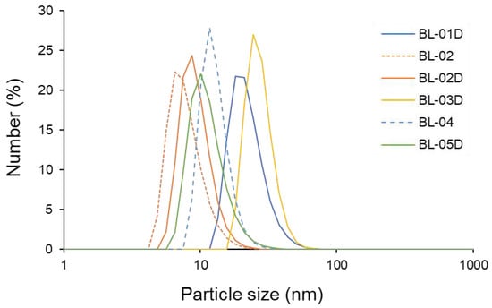 The obtained aqueous solutions were evaluated by dynamic light-scattering measurements using a 632 nm laser from a scattering angle of 173° (Zetasizer Nano ZS, Malvern Panalyrtical, Worcestershire, UK) to estimate a size distribution. The rate of decay in the photon correlation function was analyzed using the cumulant method and by applying the Stokes–Einstein equation to obtain a cumulant diameter.