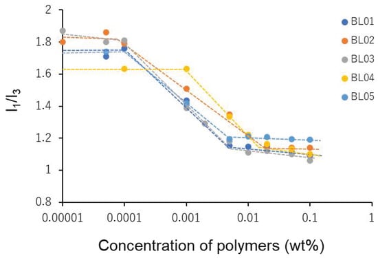 The polymers in the above prepared aqueous-solutions were observed using dynamic-light-scattering (DLS) measurements. BL-02, BL-04, and BL-05 showed small sizes of around 10 nm, and BL-01 and BL-03 showed sizes of around 20–30 nm, as summarized in Figure 4 and Table 5. This showed that all polymers were well dispersed in water. Because BL-02 can be directly dissolved in aqueous solution, BL-02 polymer-states in aqueous solution can be compared with and without utilizing pre-solutions of DEG. As a result, the sizes were almost equal. However, from the viewpoint of Đ, the scheme of using the DEG solution yielded a smaller value, emphasizing this scheme’s benefit too. Note that these sizes would be larger than the assumed sizes of single polymers having a molecular weight of around 2000–4000 Da. It is expected that they are molecularly dispersed and self-assembled as polymer micelles in aqueous milieu. This is further suggested by the following critical-micellization-concentration (CMC) measurement.