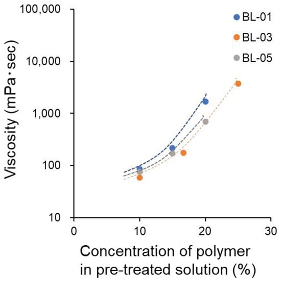 Then, the DEG pre-solutions of BL-01, 03, and 05 at varied concentrations were prepared, to change the viscosity, and were all clear and viscous solutions. As shown in Figure 6, we successfully obtained the DEG pre-solutions having a viscosity in the range from below 100 mPa⋅sec to above 1000 mPa⋅sec.