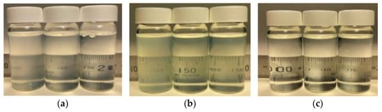 Subsequently, the DEG solutions were settled on the bottom of the sample bottles, followed by pouring large amounts of KOH aqueous solution and irradiating the ultrasonic wave for 1 h, whereby the polymer concentration finally became 0.1 wt% aqueous solution and KOH molars were 1.2 times in excess of those of the carboxyl groups contained on the polymers. When using the pre-solutions of 10 wt% BL-01 and BL-03, transparencies of the finally obtained aqueous-solutions were low, whereas the pre-solutions with the higher polymer concentrations made transparent aqueous solutions of the polymers (Figure 7 and Figure 8a). Furthermore, larger particle sizes were detected in the aqueous solutions prepared from the pre-solution with the lower concentration of the BL-01 and BL-03, i.e., with lower viscosity (Figure 8b). These results indicate that the viscosity of the pre-solution would be a crucial parameter to determine the polymer state in the aqueous solution, as we expected. On the other hand, all of the BL-05 solutions among those investigated were transparent (Figure 7c), showing that the particle size of BL-05 did not change at any concentration (Figure 8b). There might be a lower concentration range which BL-05 would not solve. This phenomenon is probably due to the slower diffusion of BL-05 from the DEG solution to the aqueous solution, expected by its larger molecular weight compared to the other two (BL-01, BL-03).