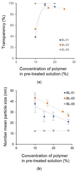 (a) Transparency at 600 nm and (b) particle size (number mean) of BL-01, BL-03 and BL-05 alkaline solution with various concentrations in pre-treated solution.