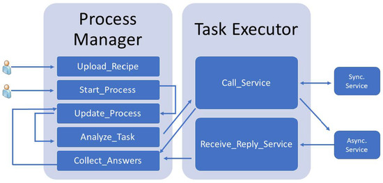 A search of the relevant scientific literature has identified articles that include adaptations in the industrial manufacturing context as a part of their proposal. For instance, [32] identifies the need to enable event-driven devices using microservices and the possibility of creating integrated workflows from data ingestion among the primary Industry 4.0 requirements. In [33], Barz M. et al. proposed a service-oriented architecture for integrating factory workers in industrial cyber-physical production environments; they used Camunda for modeling and execution. Similarly, in [34], Suri K. et al. created a semantic framework for developing IoT-aware business processes. Signavio (https://www.signavio.com/, accessed on 22 June 2021) was extended to support semantically annotated Business Process Modeling Notation (BPMN) in the process editor. [35] proposes a service-based framework architecture that uses Semantic Web technology and a workflow engine for service orchestration. Further, ref. [36] supposes a reference architecture and agile development method for engineering platforms via a Process Driven Approach (PDA) based on the BPMN standard and process engines. Moreover, [37] introduces a higher-level workflow and cloud-based SOA for individuals to design and prototype products and for manufacturing organizations to focus on their core competencies, identify complementary services that are a part of their production processes, and publish their idle capabilities. In addition, some current articles propose state-of-the-art technologies to support business processes in the industry, such as blockchain [38,39,40], Semantic Web technologies [41], or digital twins [42]. However, most of these industrial proposals lack a framework to support microservice architecture requirements as a whole.