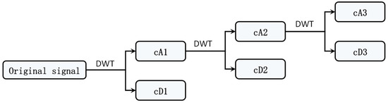 At the same time, the number of decomposition levels is also crucial. In wavelet decomposition, the signal is decomposed level by level. The decomposition of the approximate component of one level can produce the approximate component (cA) and the detail component (cD) of the next level, as shown in Figure 2.