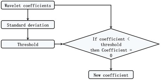 After the decomposition is completed, the effective part of the signal corresponds to a larger coefficient, and the noise corresponds to relatively small coefficient. Therefore, the coefficients in a certain interval can be filtered, and the noise will be suppressed simultaneously by setting a suitable threshold and threshold function. In general, the threshold function can be selected as either a hard or soft threshold function, both of which have advantages and disadvantages. Hard threshold functions are better than soft threshold functions in the sense of mean squared deviation, but they may produce jump points, while soft threshold functions have better continuity but produce biases that affect the reconstructed signal [5,24,25,26]. The hard threshold function working process is shown in Figure 5.