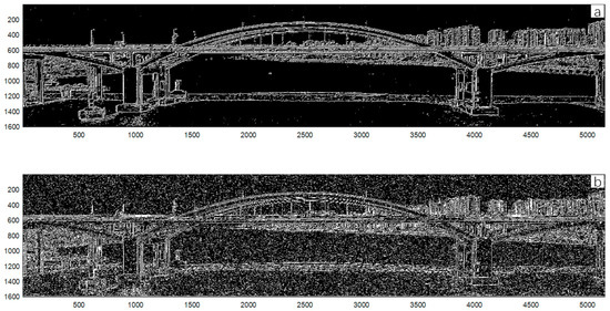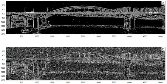 The bridge images before and after noise removal by wavelet transform were subjected to edge detection, and the results obtained are shown in Figure 7. From Figure 7a, it can be seen that the edges of the bridge are initially revealed, but the noise has affected the accuracy of obtaining the relevant detail information of the bridge, and the quality of the whole image is not good enough to provide more reference and support. Compared to Figure 7a, the effect of noise on the results has been significantly reduced in Figure 7b; the bridge edges are basically clear and the presentation of details has been improved, which shows that the removal of noise with wavelet transform before edge detection is obvious and necessary.