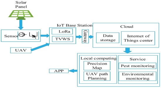 In another study [], Gao et al. presented an agricultural framework that applied to wheat crops. Figure 2 shows the proposed IoT platform, in which they have taken pictures of different parts of the crop through the Internet of Things and drones and sent them to the cloud data center to identify the environment conducive to pests in the field due to climate change. In this framework, we see that as the crop grows, the sensors collect real-time data related to the crop. Due to the size of the fields, which are large and delivering energy to the fields is a difficult task, the researchers have installed a solar system to provide energy to the sensors, which provides constant power, and the drones flying down have taken pictures of the separate parts of the field, and the same images are uploaded to the cloud that can be processed to assess the field environment and crop with the help of spectrum analysis technology. Due to the flight mode, the flight time of the drones has been extended, and the changes in the crop due to pests or diseases are monitored in the data center with the help of pictures.