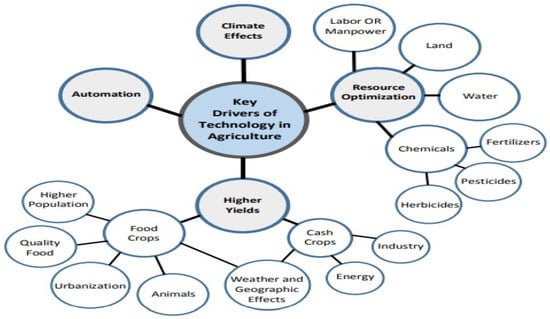 In a paper [], they proposed a framework for Phytophthora early detection. It also maps out the future of how this technology will determine the future of agriculture and what will be the factors that will hinder it and prevent its spread in the future, and what things will challenge it in the future. These papers discuss the trends of IoT and also say which issues should be resolved very soon; otherwise, there will be no benefit in adopting this technology. At the same time, people’s hopes for this technology and the limitations of this technology have been discussed. Figure 3 provides the key drivers of technology in smart agriculture. In these studies [,], researchers have made a very comprehensive review of how IoT devices have completely transformed farming similar to any other field.
