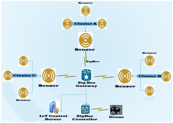 Along with the sensor, the prototype is equipped with a ZigBee transmitter (ZED) that transmits signals, and we know that this ZigBee module covers a range of 10–100 m line of sight with 250 kbps data rates, while if we use LoRA instead, our coverage and data carrying capacity will increase. As shown in Figure 5, we have divided the whole field into four clusters, and with each cluster, we have installed sensors according to its area. Each sensor is capable of sending signals to the ZigBee gateway, which is located in the center of the field. We have shown a gateway in Figure 7 and Figure 8, but we can install more than one gateway when needed.