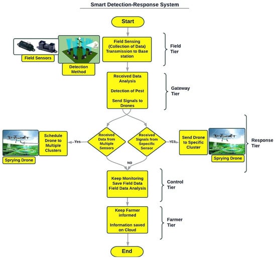 Our proposed system consists of five tiers, as shown in Figure 7, in which the first tier is responsible for sensing the data indicative of insects while the second layer will analyze this data, and the third layer is based on this analytical data towards the sensor that sends the signal to the drone. The fourth layer will be drones that will go and spray the location from where the signal is received.