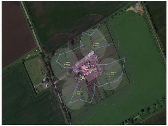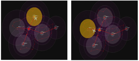 The second part of the algorithm shows the actual operation. The sensors will first send a message to the base about the presence of insects, and then the base station will send a message containing the sensor’s coordinates to the drones so that the drones can go there and respond (pesticides) accordingly. For example, if we look at the first case or the first condition of the algorithm, it is an ideal situation that the base receives a message from the sensor in the field about the presence of flying insects and the base immediately dispatches the drone to the cluster from which the message came, and it should be completely sprayed to protect crops from insects. This is the scene we have shown in the simulation in which the drone goes there and sprays after giving the message to the sensors, as shown in both parts of Figure 9.
