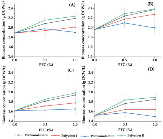 For all the studied cultures, a positive effect was noted from the presence of perfluorohexane, polyether I or polyether II in the growth medium, manifested in an increased average rate of biomass accumulation in comparison to the parameter value in the control (without PFC) (Figure 1 and Figure 2).