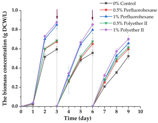 For all the studied variants, in the presence of PFCs at the end of each cycle, the biomass increased the level of the same parameter revealed for cells in the control, where PFCs were absent. The maximum excess of the level of biomass accumulation as compared to the control was about ~25% (Figure 1). The 10.5–12% decrease in the rate of free cell biomass accumulation in the control was comparable with a decrease in the rate of microalgae cell biomass accumulation in the medium with 0.5% (v/v) PFC for three cycles of using an immobilized inoculum. The decrease in the rate of biomass accumulation was 20–23% for three working cycles when 1% (v/v) PFC was introduced into the media.