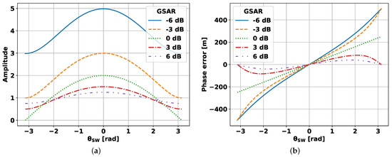 We now demonstrate the amplitude and phase error obtained under the influence of sky-wave interference for different GSAR and . Figure 3 presents the amplitude of the sum signal on the left (Figure 3a) and the phase error with respect to the ground wave on the right side (Figure 3b) for ground-wave-dominated (GSAR = 6 dB) to sky-wave-dominated (GSAR = −6 dB) conditions. Starting from the amplitude plot, we can observe that, as the GSAR decreases, the amplitude estimate can be greater or smaller than the true one. In particular, this depends on the phase difference between the ground-wave and the sky-wave and on the GSAR, which influences the resulting interference. When the phase difference is zero, the interference is constructive, which means that the signal strength, or amplitude, increases, and the reach is the maximum. In contrast, when the signals are out of the phase ( or ), the interference is destructive and the signal strength decreases.