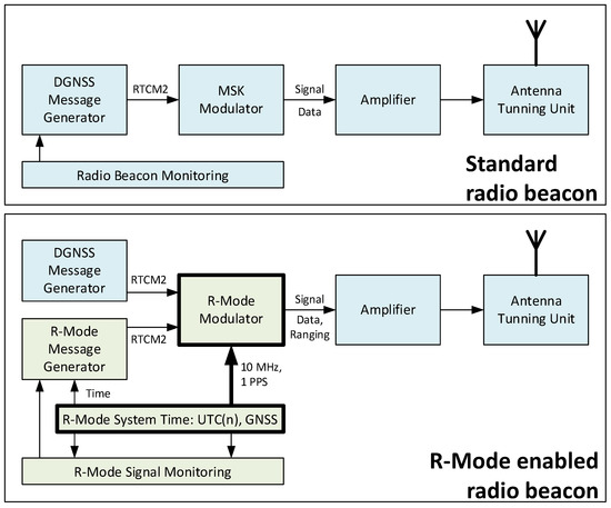 MF radio beacons were not initially designed to be used as a stand-alone positioning system. Therefore, some adaptations and modifications are needed for the hardware on the transmitter side. In principle, these adjustments, needed to enable R-Mode signals transmission, could be easily implemented at the sites. Figure 4 presents the generalized difference in architecture between a standard DGNSS beacon and an R-Mode-enabled radio beacon. First of all, the MSK modulator must be replaced with an R-Mode modulator, then, two additional components are required: an R-Mode message generator and a stable and accurate timing source synchronized with the R-Mode system time. The last component required is an R-Mode signal monitor. This solution is extremely cost-efficient when compared to the deployment of a new GNSS satellite.