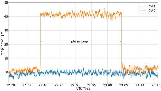 Nevertheless, the hardware components in the standard radio beacons are not identical. They differ depending on the country. In general, different manufacturer and different hardware specifications might be used in different countries. For this reason, transmitter-side instability effects can be observed for some radio beacons but not for others, even in the same country. As an example, we show in Figure 5 an issue that was identified at the Groß Mohrdorf station. In detail, a phase jump in the order of 40 m is visible for Groß Mohrdorf, lasting approximately 25 min. It is interesting to observe that the jump affects one of the signals, the CW2, but not the other. This behaviour was observed from time to time, with varying severity—a clear cause has not yet been identified. In the future, these instabilities can be avoided by identifying their source or by using monitor stations with correction information sent to the R-Mode users by specific R-Mode messages.